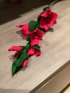Voor mijn buurtjes, die 20 jaar getrouwd zijn, maakte ik een viltbouquet. Ze waren er ontzettend blij mee – extra fijn, want de buurvrouw heeft allergieën voor sommige bloemen.