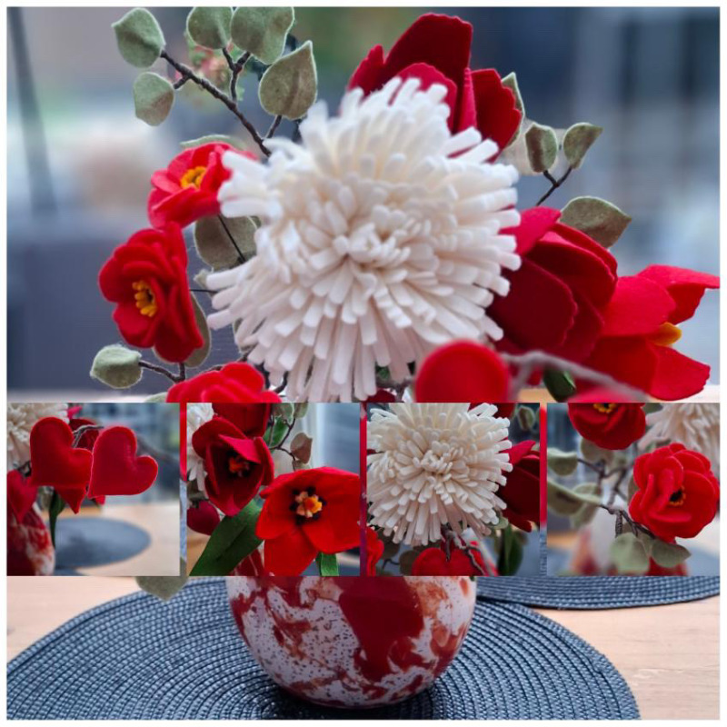 Voor mijn buurtjes, die 20 jaar getrouwd zijn, maakte ik een viltbouquet. Ze waren er ontzettend blij mee – extra fijn, want de buurvrouw heeft allergieën voor sommige bloemen.
